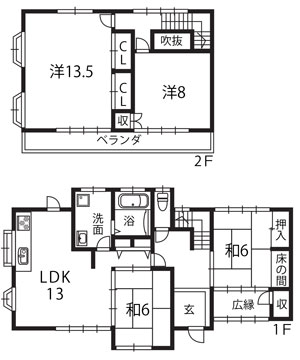 | 小学校区 | 長浜小学校区 | 間取り | 1F:LDK13/和6/和6 2F:洋13.5/洋8 |
